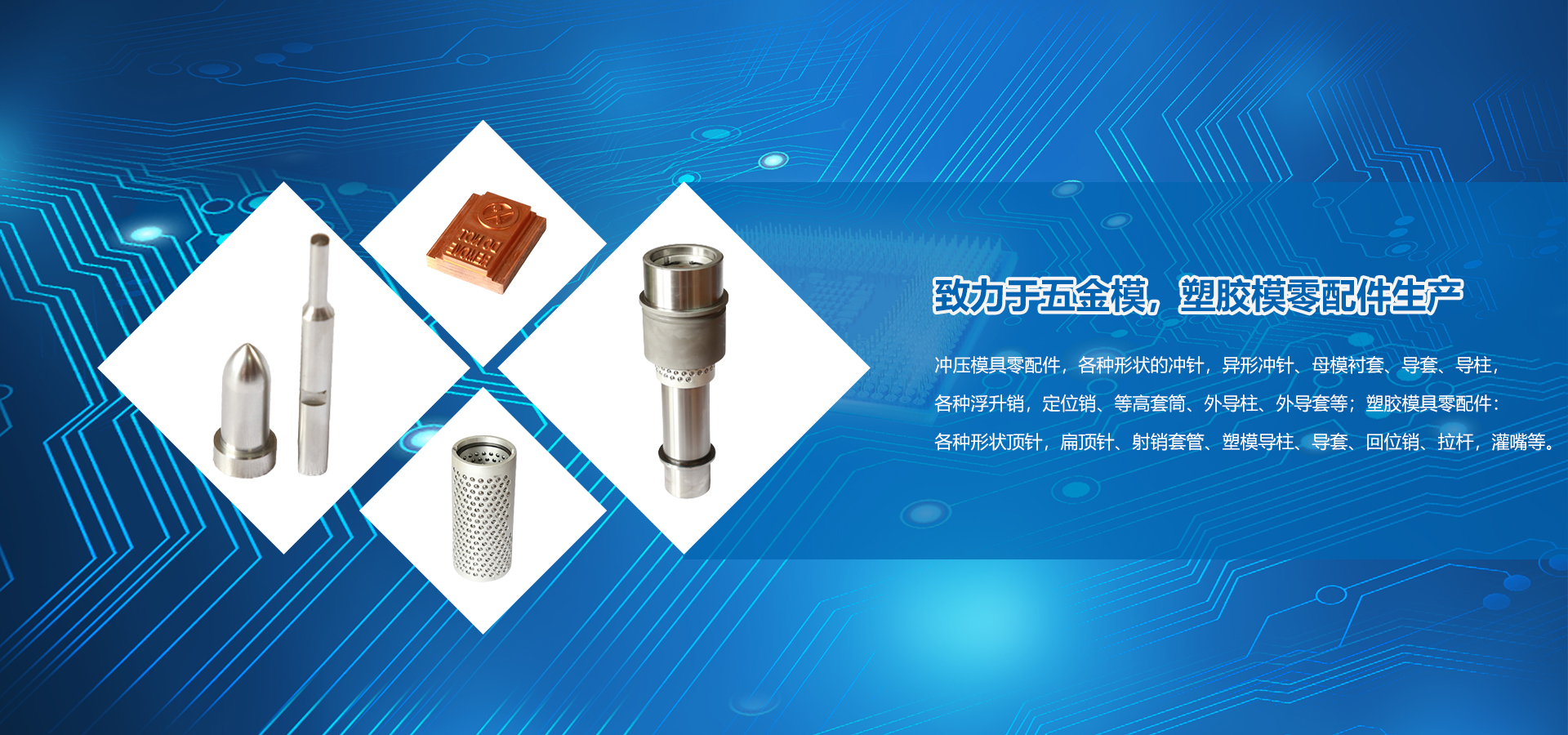 ??我公司專業生產:沖壓模具零配件,各種形狀的沖針,異形沖針、母模襯套、導套、導柱,各種浮升銷,定位銷、等高套筒、外導柱、外導套等;塑膠模具零配件:各種形狀頂針,扁頂針、射銷套管、塑模導柱、導套、回位銷、拉桿,灌嘴等。